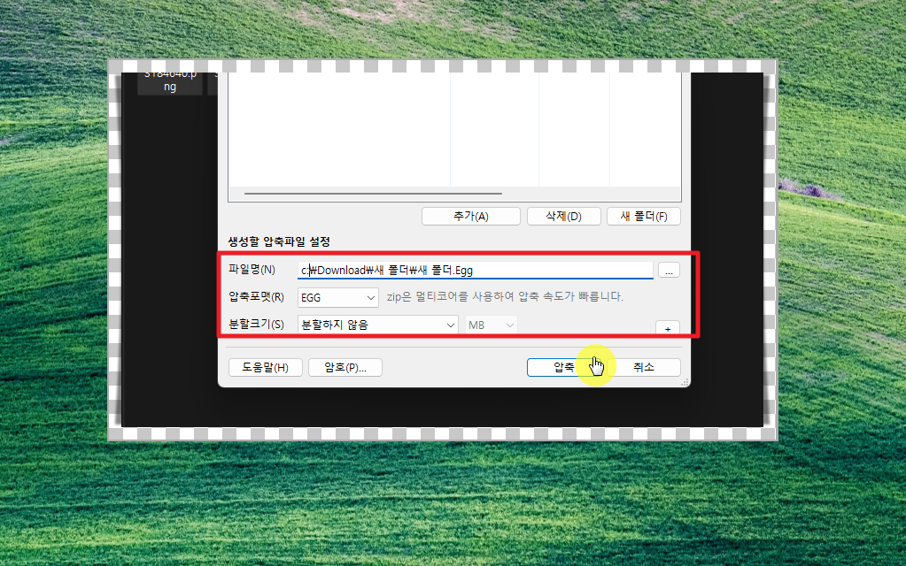 여기에서 압축포맷을 egg로 선택한 후 [압축] 버튼을 클릭하면 됩니다.