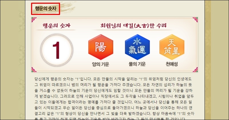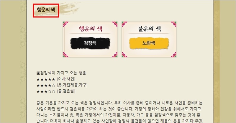 행운의 색도 이곳에서만 볼 수 있는 내용이에요. 사람마다 행운을 가져다 주는 색과 그렇지 않은 색이 있어요. 검정색의 경우 이사, 사업에 좋은 영향을 주고, 옷, 가전제품, 가구의 색을 검정색으로 맞추면 좋은 운이 들어온다고 해요.
