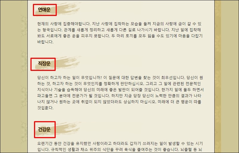 토정비결을 통해 연애운, 직장운, 건강운에 대해서도 알아볼 수 있는데요. 본인이 2021년에 가장 중요하게 여기는 부분에 대하여 꼼꼼히 읽어보면 도움이 될 만한 내용을 찾을 수 있어요.
