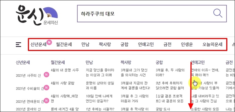 홈페이지 메인화면을 보면 2021년 사주의 신부터 오늘의 운세까지 꽤 많은 운세 서비스가 보일 거에요. 일단 이를 뒤로 한 채 마우스에 있는 휠을 돌려 화면 맨 끝으로 이동해 주세요.