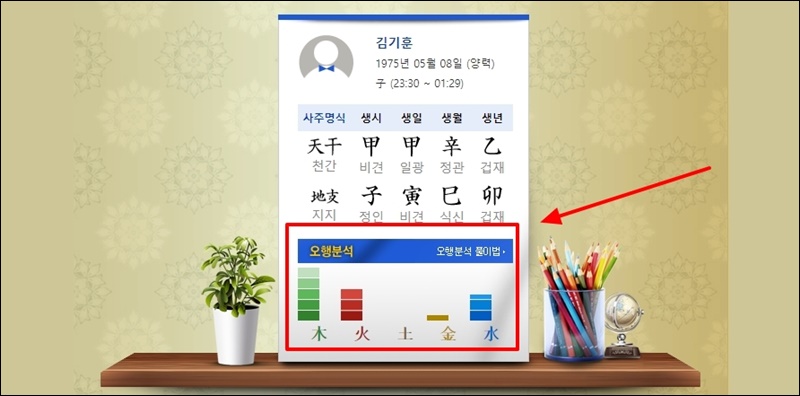 가장 먼저 나의 오행분석 결과를 무료로 볼 수 있어요. 사람에 따라 목, 화, 토, 금, 수 중에서 어떤 것은 많고, 또 어떤 것은 적을 수 있어요.