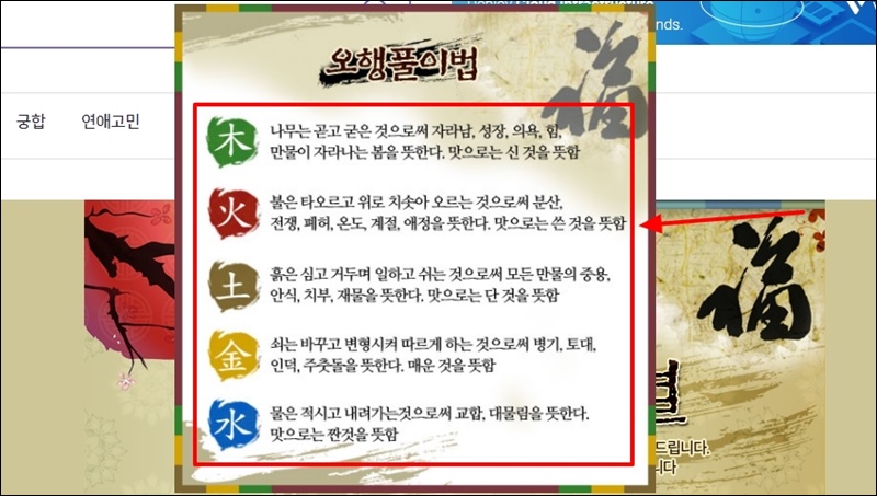 오행분석 풀이법을 클릭하면 위와 같이 오행별로 무엇을 의미하는지 알 수 있는데요.