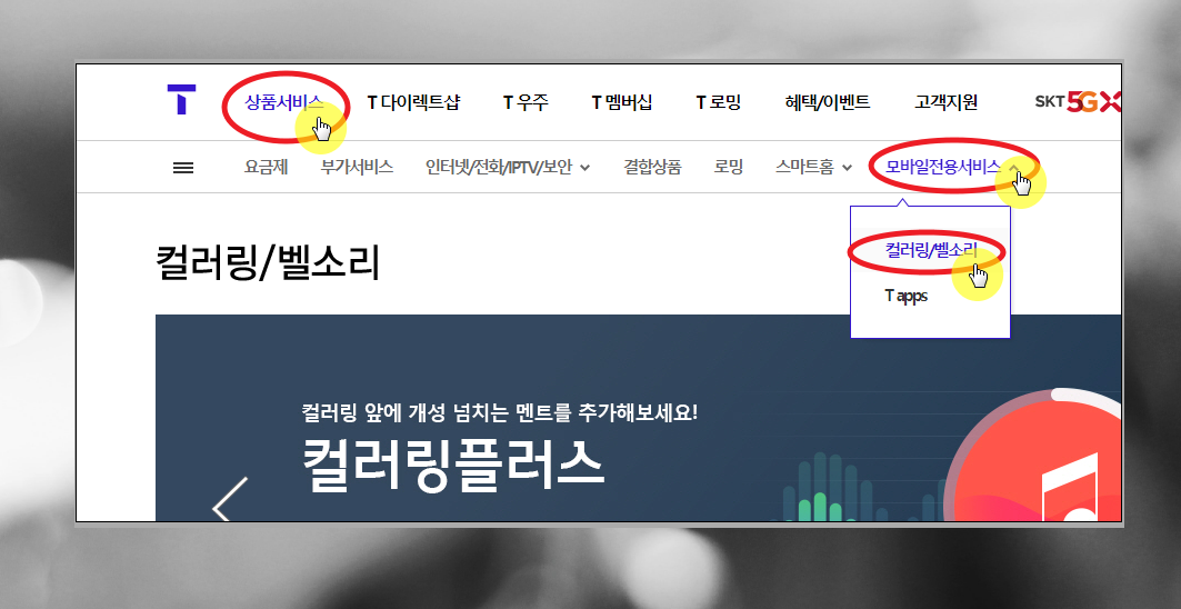 그 다음 [모바일 전용 서비스]를 선택하면 컬러링과 벨소리 관련 메뉴를 찾을 수 있습니다.