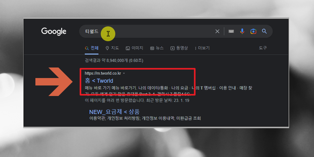 티월드 사이트에 접속하면 메뉴에서 [상품서비스]를 선택합니다.