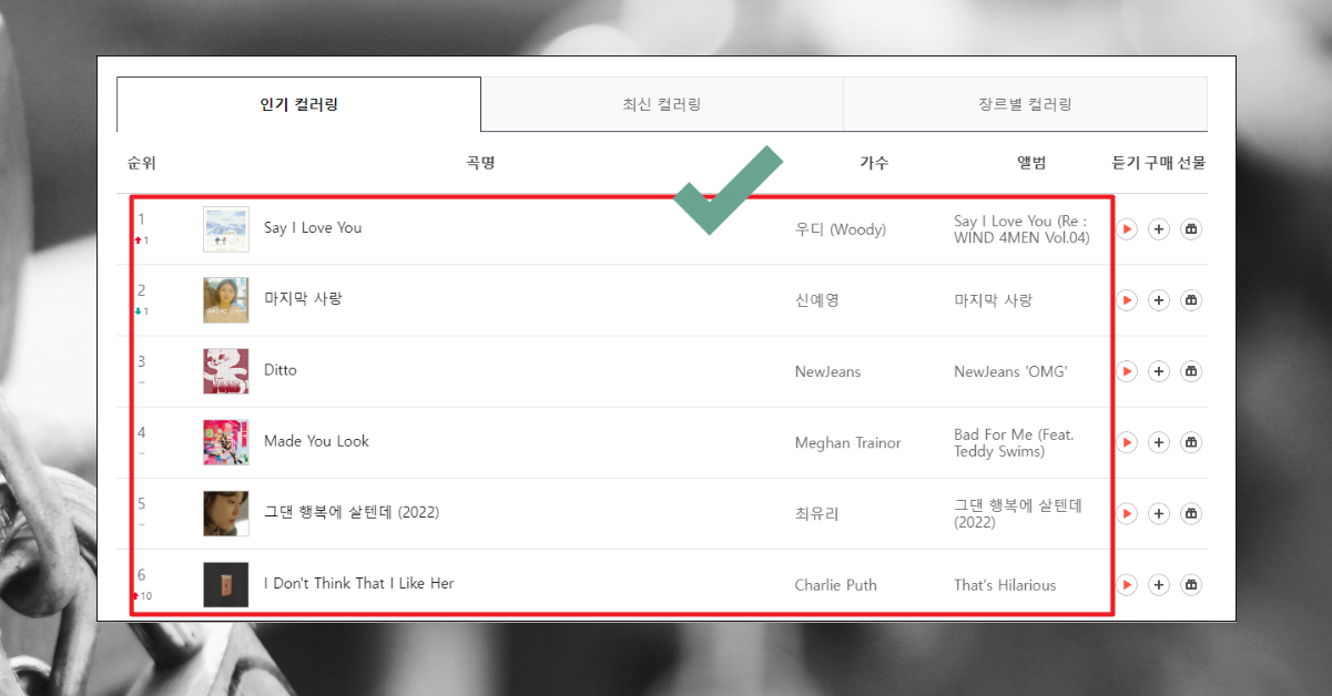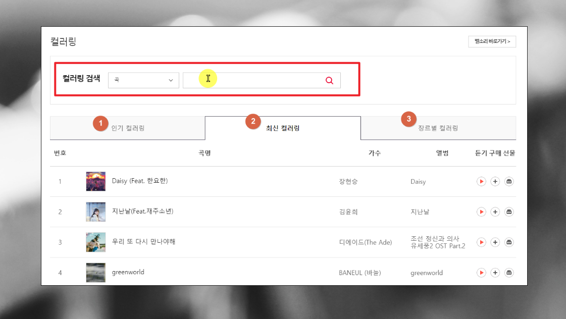 검색창 아래에는 인기곡, 최신곡, 장르별 순위를 확인할 수 있는데요.