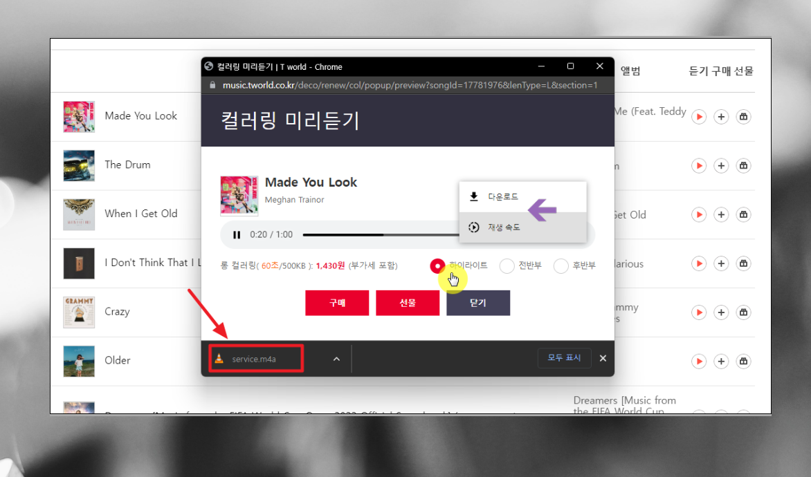 티월드의 경우에는 재생바에서 맨 우측에 있는 버튼을 클릭하면 다운로드 버튼이 활성화 되는데요.