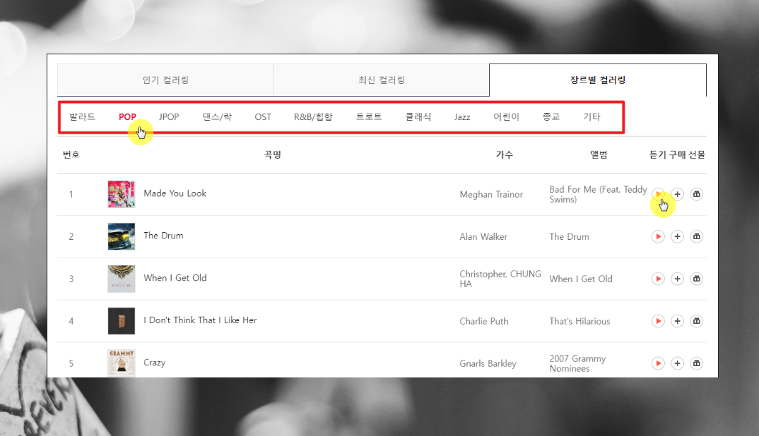 발라드, 팝, OST, 댄스, 락, 힙합, 트로트, 클래식, Jazz 등 꽤 많은 장르가 나타나는데요.