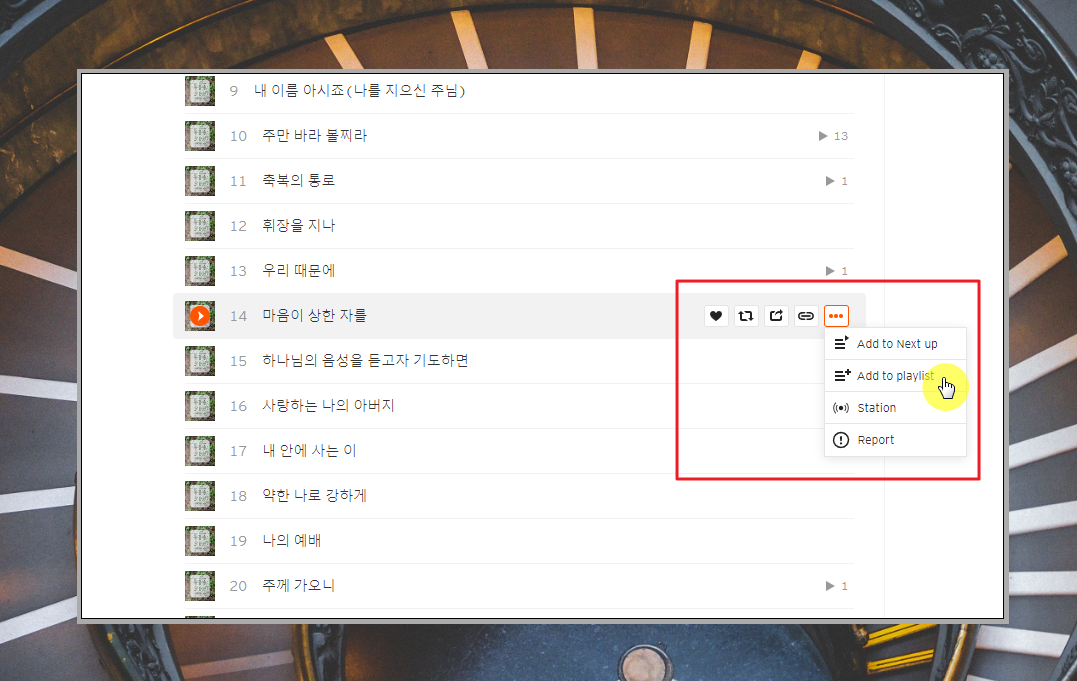 여기 포함된 곡 중에서 마음에 드는 곡만 골라서 나만의 베스트 모음을 만드는 것도 가능해요. 제목 옆에 있는 점 3개 모양의 버튼을 누르면 모음(플레이리스트)에 추가하는 메뉴를 찾을 수 있어요. 이 앨범에는 베스트 복음송에 해당하는 것들이 많은데요. '마음이 상한 자', '하나님의 음성을 듣고자 기도하면', '내 안에 사는 이', '나의 예배', '주께 가오니' 등 정말 좋은 곡이 많습니다.