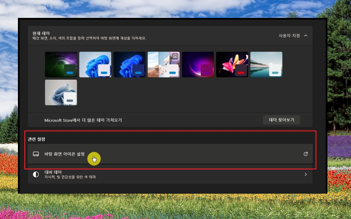 3. 테마 창이 열렸습니다. 이곳에서는 멋있는 윈도우 테마를 사용할 수 있도록 되어 있는데요. 하단이나 오른쪽 부분을 보면 관련 설정 메뉴가 있습니다. 여기에서 바탕화면 아이콘 설정 메뉴를 선택해 주세요.