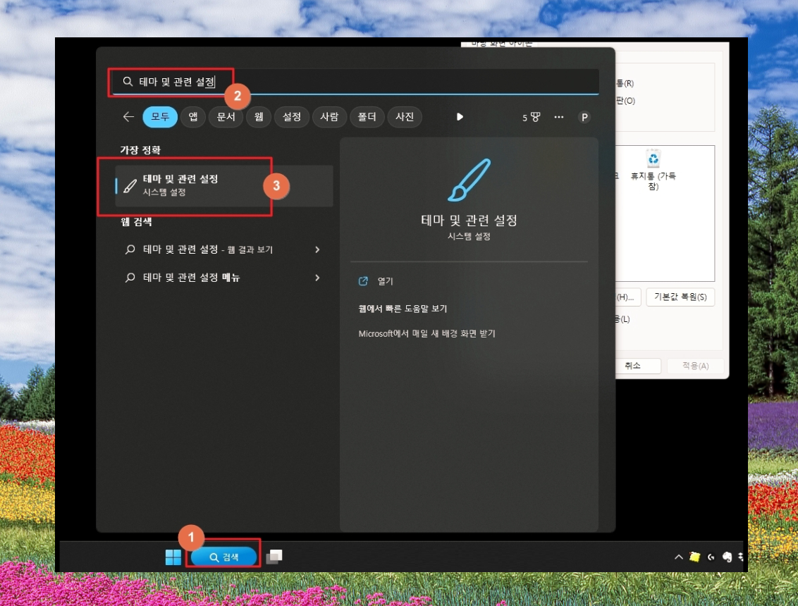 6. 조금 더 빨리 바탕화면 문제를 해결하고 싶을 때는 시작 버튼을 누른 후 테마 및 관련 설정이라고 키보드로 입력을 해 보세요. 그럼 좀 더 빠르게 테마 창을 열 수 있어요.