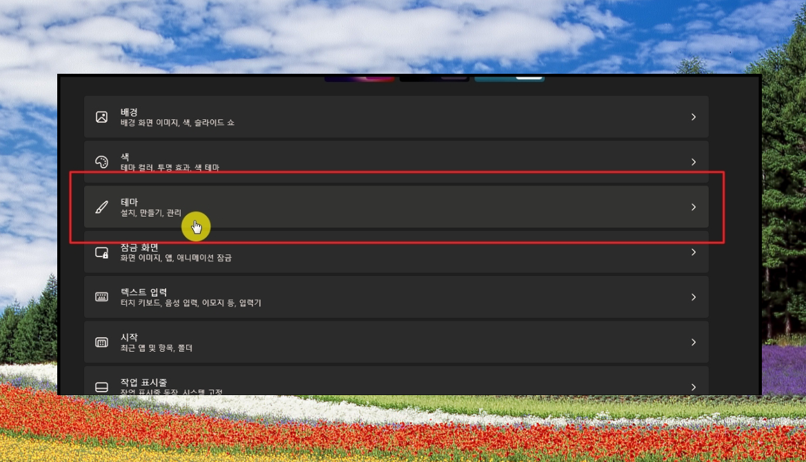 2. 개인 설정을 통해서 윈도우의 여러가지 모양을 변경할 수 있는데요. 여기에서는 바탕화면의 아이콘에 관련된 것도 설정이 가능해요. 배경 색 테마 잠금화면 등 여러가지 서비스가 보이는데요. 이 중에서 세 번째 위치한 테마 메뉴를 선택해 주세요.