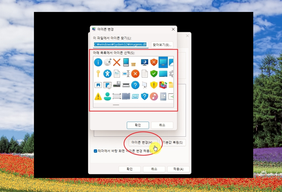 5. 내 마음대로 사라졌던 아이콘을 다른 모양으로 바꾸는 것이 가능한데요. "변경" 버튼을 누르면 해당 기능을 사용할 수 있습니다.
