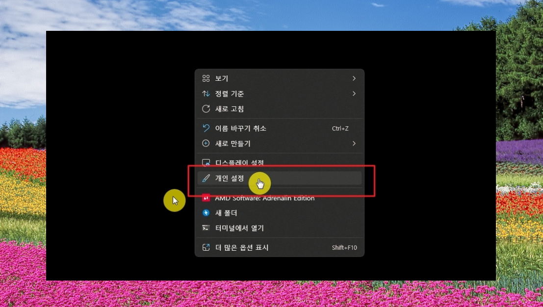 1. 일단 컴퓨터를 켜고 윈도우 바탕화면이 나타나도록 합니다. 여기에서 마우스 오른쪽 버튼을 클릭해 보세요. 그럼 여러가지 메뉴가 나타납니다. 여기에서 개인 설정 버튼을 선택해 주세요.