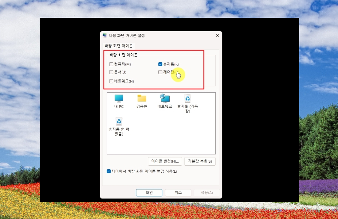 해당 화면에서 위쪽에 있는 체크박스를 눌러 체크 표시를 하면 아이콘이 사라진 것을 다시 되돌릴 수 있어요. 이렇게 쉽게 "바탕화면 아이콘이 사라졌어요" 문제를 해결할 수 있습니다. 반대로 바탕화면에 아무것도 나타나지 않게 하고 싶다면 모두 체크를 해제 하면 됩니다.