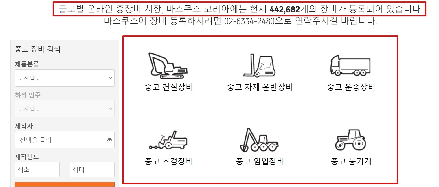 마스쿠스의 경우 442,682개의 장비가 등록되어 있을 정도로 굉장히 많은 매물을 다루고 있습니다. 그만큼 다루고 있는 기기의 종류도 많은데요. 그린중기와 함께 이용하면 좋습니다.