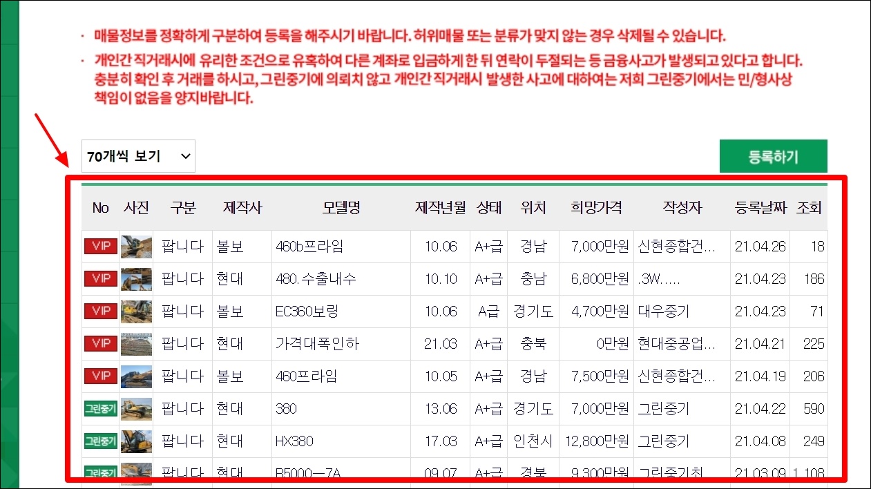매매 게시판을 살펴보겠습니다. 그림중기에 등록된 중고 매물정보를 확인할 수 있는데요. 리스트를 통해 중기에 대한 제작사, 모델명, 제작년월, 상태, 위치, 희망가격, 등록날짜 등을 확인할 수 있습니다. 조회수를 보면 많은 사람들이 그린중기 매매상사를 이용하고 있음을 알 수 있습니다.