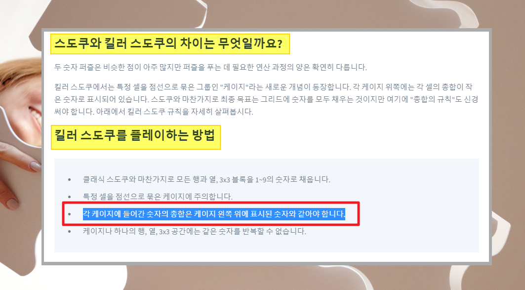 메뉴에서 [클래식]을 [킬러]로 변경 및 선택해 보세요. 그럼 킬러 모드로 된 스도쿠 게임을 즐길 수 있는데요. 처음 보시는 분도 많을 거에요. 굉장히 어려워 보일 수 있는데요. 꼭 그렇진 않습니다. 제 입장에서는 오히려 좀 더 쉬워진 느낌이에요. 추가적으로 생각해봐야 할 요소가 하나 더 생겨서 스도쿠 게임의 재미가 더 높아졌어요.