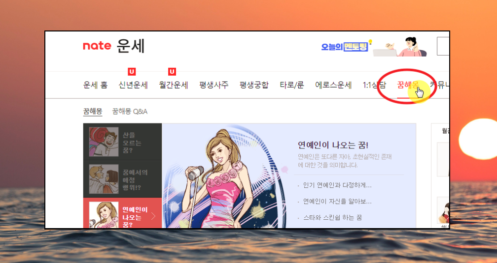 두번째 서비스를 이용하기 위해서는 네이트 운세 사이트에 접속해 야 됩니다. 이곳에서는 여러가지 무료 역술 서비스를 제공하고 있는데요. 그 중에는 해몽 서비스도 포함 되어 있어요.