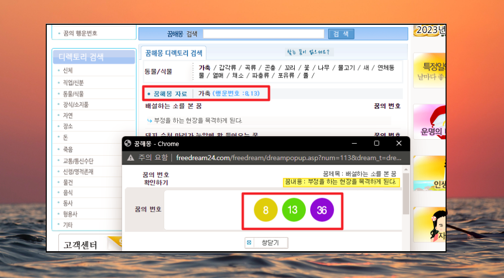 첫번째 사이트의 경우에는 로또 구매를 할 때 행운을 가져다 주는 숫자가 어떤 것인지 힌트를 얻을 수 있어요. 두번째의 경우에는 상세한 해석과 나에게 이로운지 또는 해로운지에 대해 명확하게 알아볼 수 있습니다.
