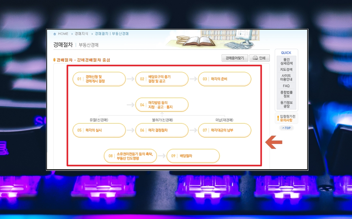 2. 처음 경매 사이트에 접속하면 메뉴가 많아서 복잡해 보일 수 있는데요. 경매에 참여해본 적이 없다면 우측 하단에 있는 "부동산 경매절차" 버튼을 클릭해 주세요. 이외에도 비용이나 매수 신청 대리안내 등 여러 가지 메뉴얼을 살펴볼 수 있습니다.