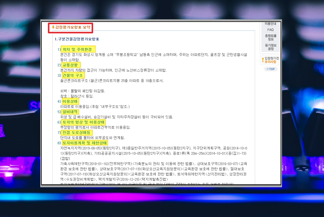 8. 부동산 매물을 살펴볼 때 가장 주의 깊게 봐야 하는 부분은 "감정평가요항표 요약" 부분입니다. 해당 아파트에 대한 위치 및 주위환경, 교통상황, 건물의 구조, 이용상태, 설비내역, 인접 도로상태, 토지의 형상 및 이용상태 등을 살펴볼 수 있도록 자세히 표기되어 있습니다.