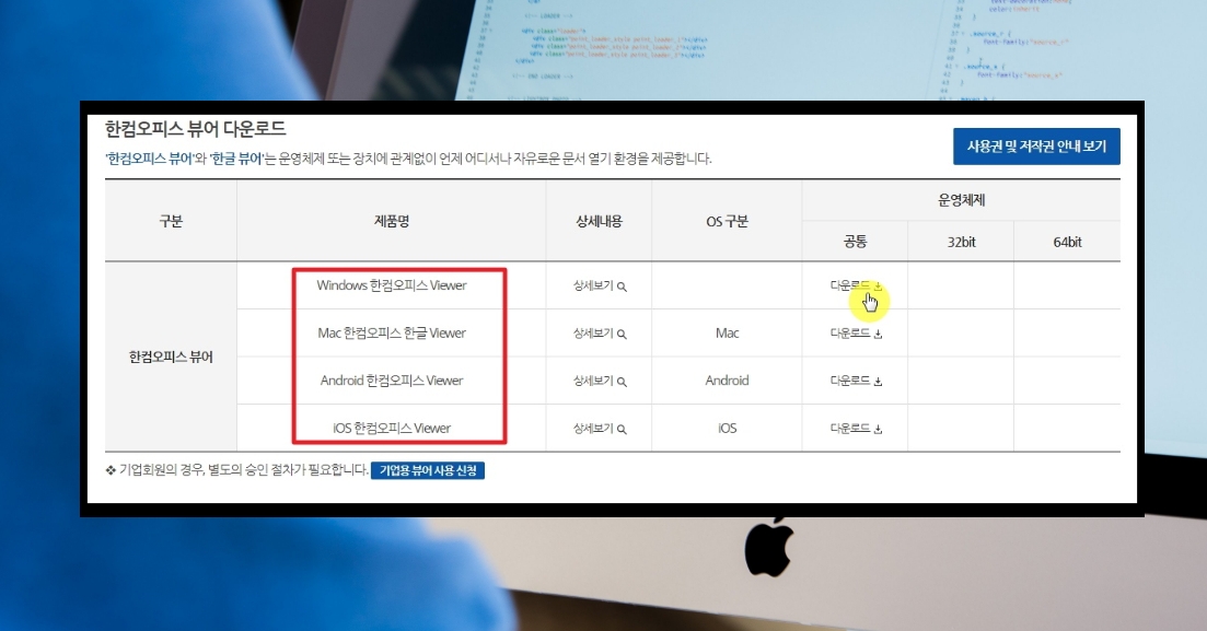 9. 메뉴를 눌러 열린 페이지에서 화면을 쭉 아래로 내려보면 한컴오피스 뷰어가 나타납니다. 윈도우, 맥북, 안드로이드, IOS에서 사용할 수 있는 한컴오피스 뷰어를 무료다운 받을 수 있습니다.