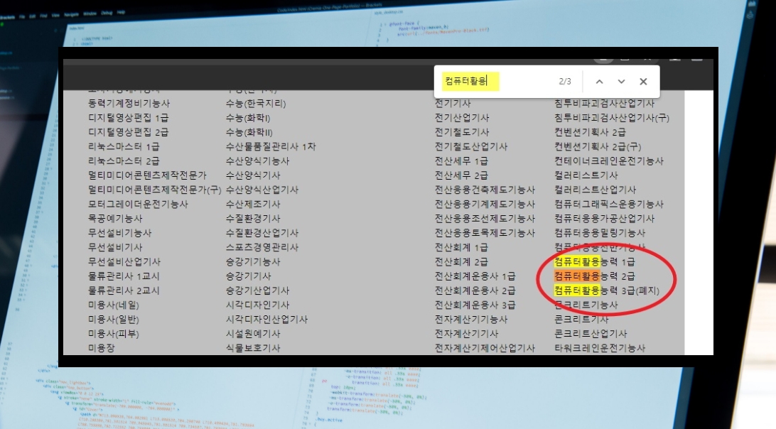 3. comcbt 사이트에 접속했습니다. 여러 자격증 이름으로 된 리스트가 나타나는데요. 엄청나게 많기 때문에 컴활2급 기출문제를 빨리 못 찾을 수 있습니다. 이런 경우에는 컨트롤과 F 버튼을 같이 눌러 검색을 해보세요. "컴퓨터활용"이라고 검색을 하면 컴퓨터활용능력 1급, 2급, 3급을 찾을 수 있습니다. 컴활3급의 경우에는 현재 폐지가 된 상태입니다.