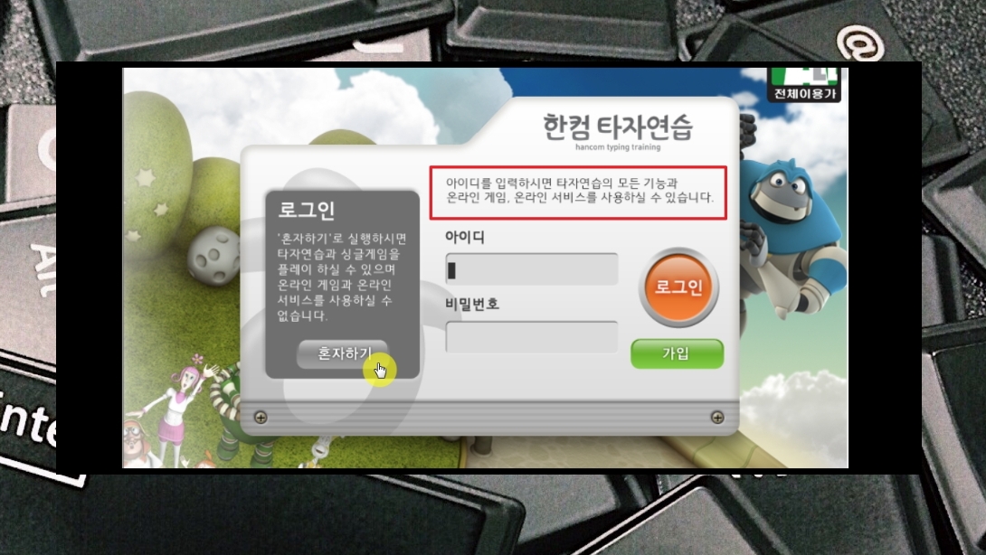 5. 설치 완료 후 윈도우 시작 버튼을 클릭하면 "한컴 타자연습 2020 바로가기" 메뉴가 생겼을 겁니다. 해당 메뉴를 클릭하여 프로그램을 실행해 봅니다. 처음에 로그인과 혼자하기 버튼이 나타납니다. [혼자하기]를 선택해도 사용이 가능하지만, 모든 기능을 사용하고 싶으면 로그인을 해주세요.