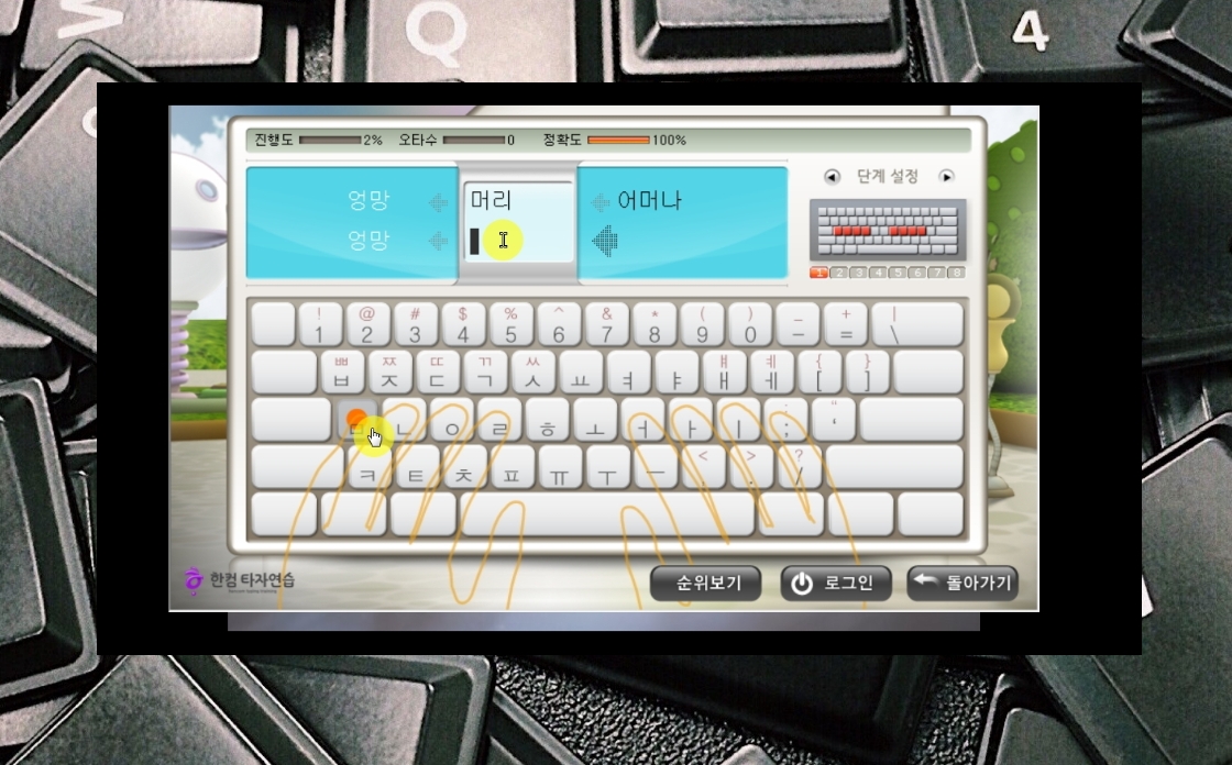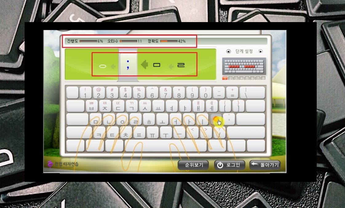 8. 자판 자리를 익힌 후에는 낱말을 가지고 연습을 진행합니다. 다음 단계로 넘어가고 싶은 경우에는 [단계 설정] 옆에 있는 화살표 버튼을 클릭하면 됩니다.