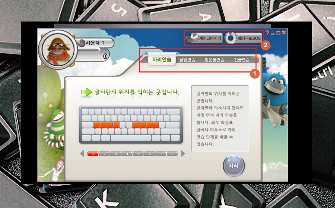 6. 해당 프로그램을 통해 자리 익히기, 낱말, 짧은글, 긴글에 대한 연습을 할 수 있습니다. 여기에 더하여 즐겁게 할 수 있는 게임도 준비되어 있습니다. 케이크 던지기와 해상구조 SOS 입니다.