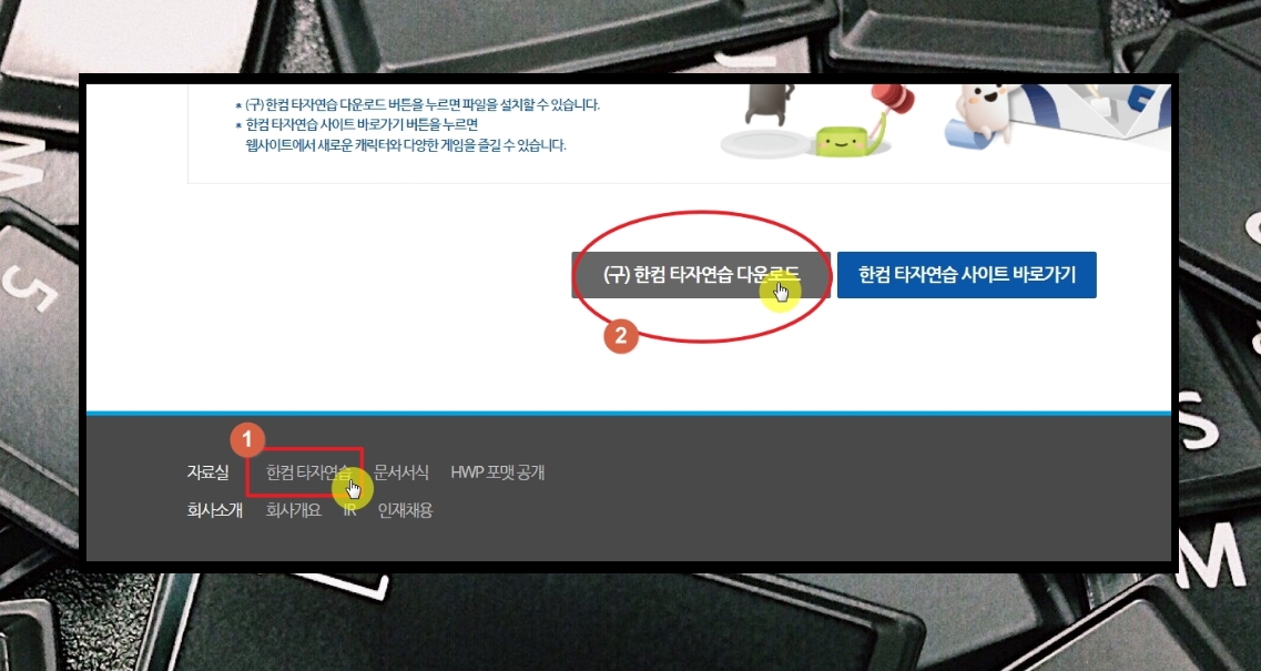 3. 웹사이트에 접속하게 되면 화면을 쭉 아래로 내려좁니다. 그럼 자료실 카테고리가 나옵니다. 여기에서 [한컴 타자연습]을 선택합니다. 참고로 한컴에서는 문서서식도 제공하오니 필요할 때 사용하시길 바랍니다.
