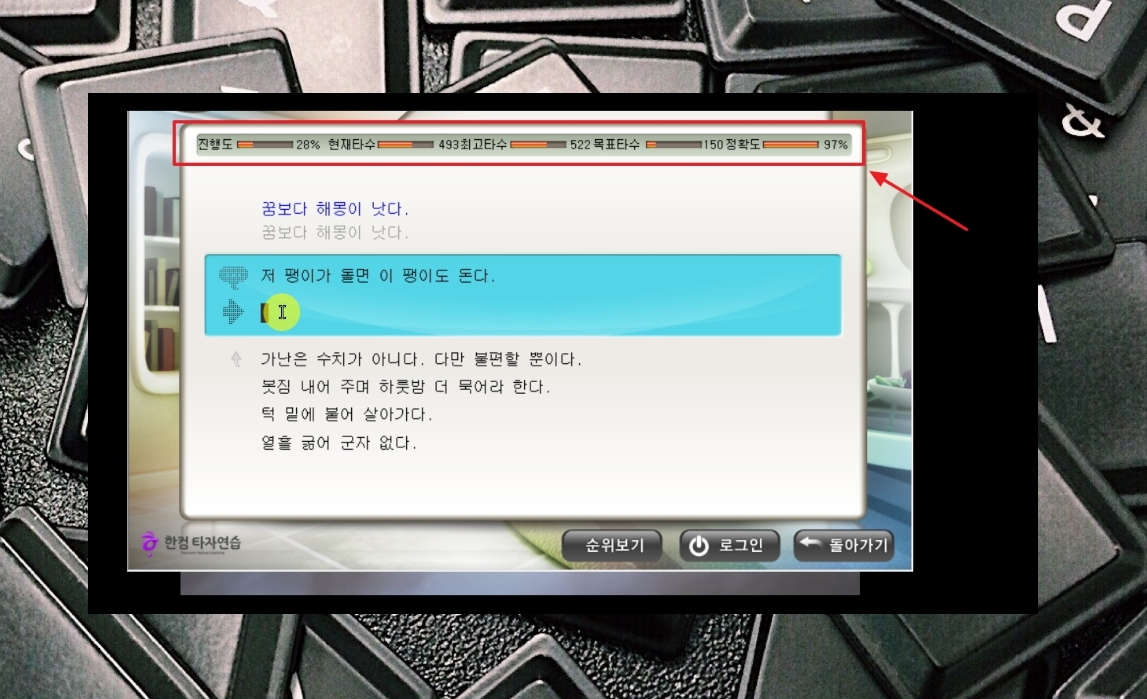 9. 낱말 다음에는 짧은 글 과정을 진행합니다. 여기부터는 진행도, 현재타수, 최고타수, 목표타수, 정확도 확인이 가능합니다. 이정도 치면 실력 향상이 빠르게 되는 것을 느낄 수 있습니다.