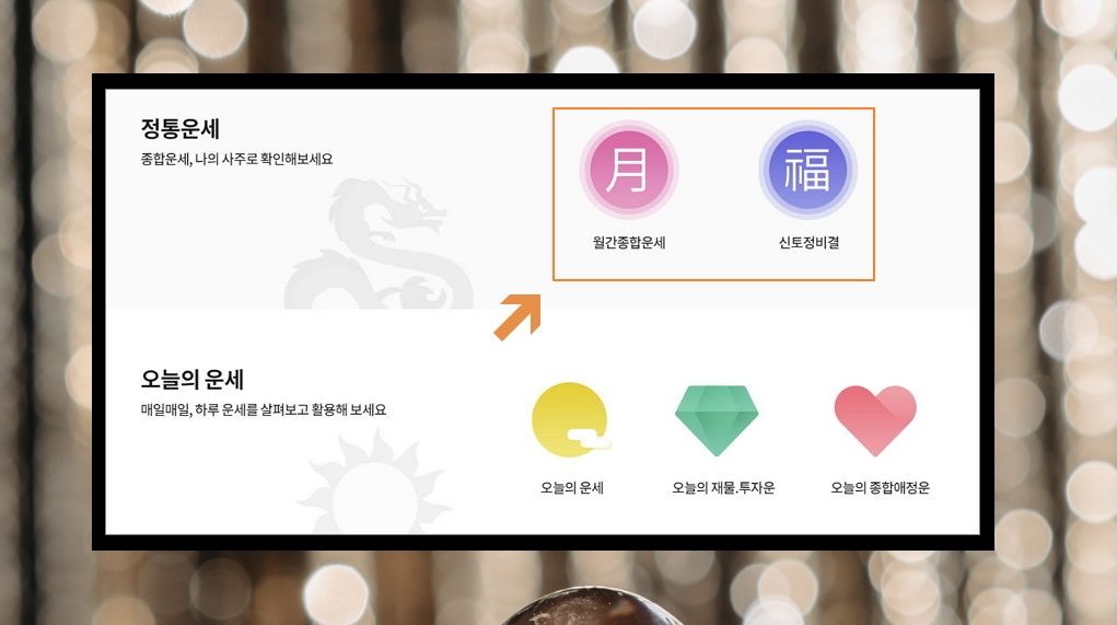 3. 여기서 이용할 수 있는 운세 서비스는 여러 가지가 있어요. 각자 보는법이 다른데요. 사주를 가지고 볼 수 있는 운세 서비스는 월간종합 및 오늘의 운세, 신토정비결, 재물 및 투자운, 애정운이 있어요.