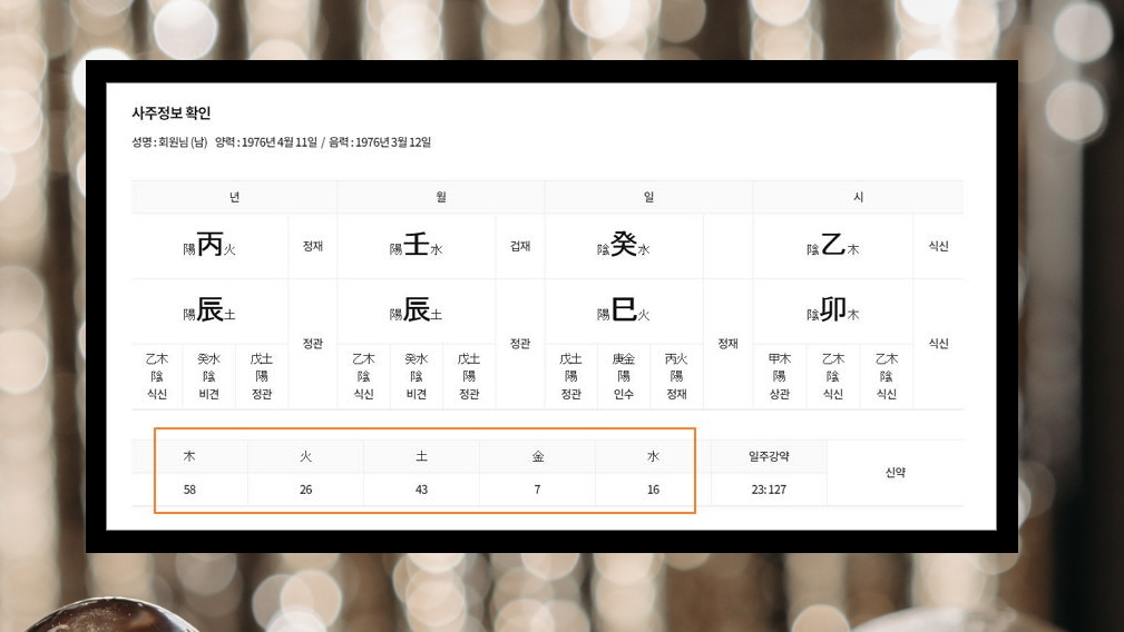 6. 가장 먼저 나타나는 것은 사주정보에요. 전문가만 알 수 있는 부분이니 넘어갈게요. 자신의 오행을 간단히 알 수 있는데요. 오행 보는법을 알아야 그 뜻을 알 수 있어요.