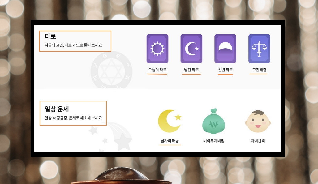 4. 서양에서 인기 있는 타로를 가지고 간단히 보는 역술 서비스도 있어요. 타로 카드점인데요. 간단히 카드를 뽑아 오늘, 이번 달, 올해에 대한 나의 운명을 보는 데에 적합해요. 고민이 있을 때에도 유용하고요.