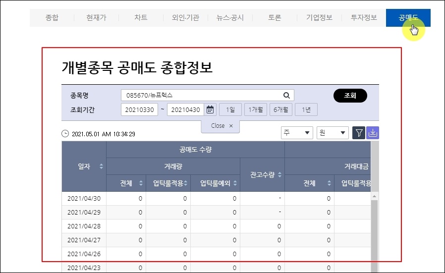 5월달에 공매도 재개로 인해 많은 분들이 이에 관심이 많으실텐데요. 해당 사이트를 통해 개별종목 공매도 종합정보를 확인할 수 있습니다. 공매도 수량, 거래량, 잔고수량, 업틱률 적용 또는 예외와 같이 여러 가지 사항을 확인 가능하오니 참고하시길 바랍니다.