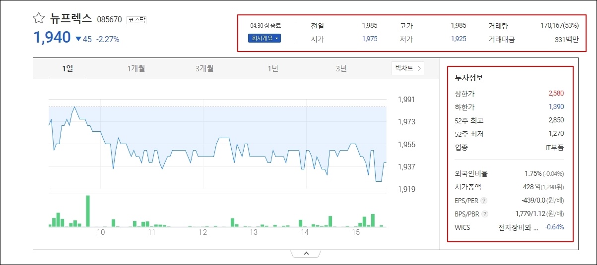 실시간으로 볼 수 있는 주식 차트와 함께 시세정보, 투자정보가 나타났습니다. 투자정보를 보면 외국인비율, 시가총액, EPS, PER, BPS, PBT과 같이 주식투자를 할 때 참고하기 좋은 정보를 확인할 수 있어요.