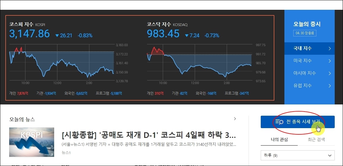 사이트에 접속하면 전종목 시세보다 먼저 확인해야 할 것이 있습니다. 바로 코스피와 코스닥 지수인데요. 이 두가지 지표를 통해 모든 주식의 흐름을 쉽게 파악할 수 있습니다. 장이 열리면 실시간으로 변하는 지표이기 때문에 주식투자를 하면서 참고하기에 좋습니다.