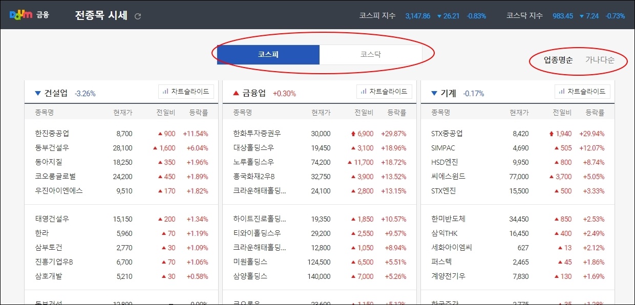 우리가 찾던 실시간 주식 전종목 시세를 볼 수 있는 페이지가 나타났습니다. 국내 주식은 코스피와 코스닥 종목으로 구분되어 있는데요. 주식 종목들이 같은 업종끼리 묶여 있기 때문에 더욱더 보기에 좋습니다. 각 업종마다 평균 시세가 어떠한지도 확인이 가능해요.