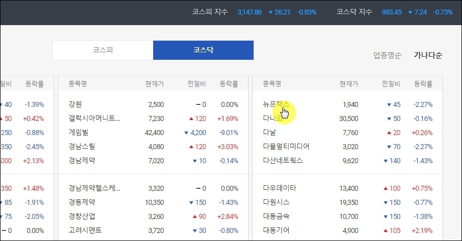 코스닥에 해당하는 전종목 시세도 살펴보았습니다. 가나다순으로 정렬을 해보았는데요. 이렇게 하면 어떤 주식이든 굉장히 빠르게 찾을 수 있다는 장점이 있습니다. 전체적으로 볼 때에는 현재가, 전일비, 등락률 이렇게 3가지 지표밖에 확인이 못하는데요. 종목명을 클릭하면 해당 종목에 관련된 정보를 많이 얻을 수 있습니다.
