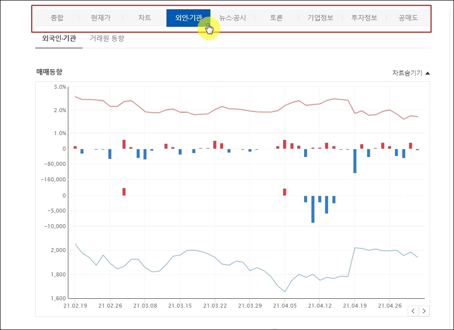 해당 페이지 하단을 보면 여러 가지 메뉴가 있는데요. 현재가, 차트, 외인과 기관의 매매 동향, 실시간 뉴스, 공시, 토론, 기업정보, 공매도 관련 정보가 있습니다. 여기서 제공하는 차트는 실시간으로 움직이는 차트입니다.