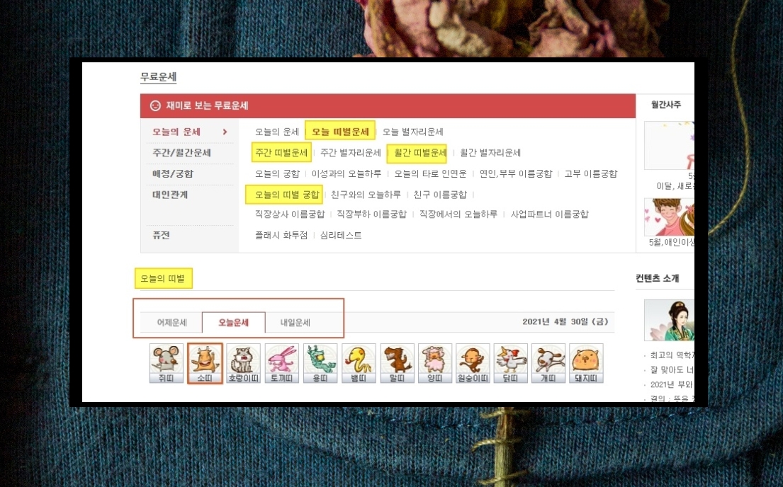 3. 재미로 볼 수 있는 무료 역술 서비스가 20가지 정도 됩니다. 우리가 찾고 있었던 띠별 오늘 운세는 물론이고, 주간이나 월간의 운을 보거나 사람과 사람 사이의 오늘 궁합도 볼 수 있네요.