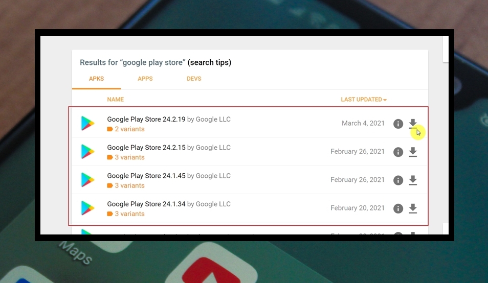 3. 검색 결과를 보면 여러 가지 버전으로 구글 플레이 스토어가 나타남을 알 수 있어요. 기기에 해당 어플리케이션을 설치할 때 주의해야 할 점이 있어요. 무조건 최신 버전을 이용하는 것이 능사가 아니란 것이에요. 구형폰을 사용하거나 스마트폰이 아닌 기기의 경우 최신 버전보다는 그 이전에 나온 버전을 사용해야 제대로 어플이 작동하는 경우가 많기 때문이에요.