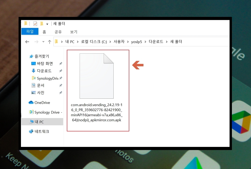 6. 방금 다운로드 받은 구글 플레이 스토어 apk이에요. 해당 파일을 가지고 설치를 진행하려면 컴퓨터에서 스마트폰으로 전송을 해야 해요. 케이블을 연결하거나 Send Anyware 같은 앱을 이용하면 쉽게 전송할 수 있어요.