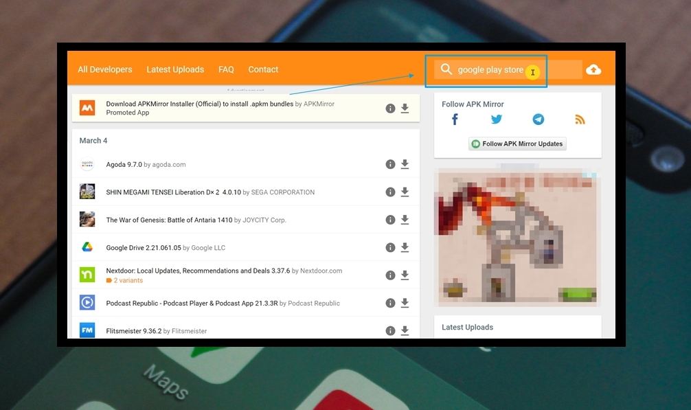 1. 기기에 구글 플레이 스토어가 설치되어 있지 않은 상태이기 때문에 일반적으로 많이 이용하는 방법으로 앱 설치를 할 수 없어요. 이러한 경우에는 스마트폰 프로그램의 Install 파일이라고 할 수 있는 APK 파일을 이용하면 되는데요. 해당 파일은 apkmirror 사이트에서 쉽게 구할 수 있어요.