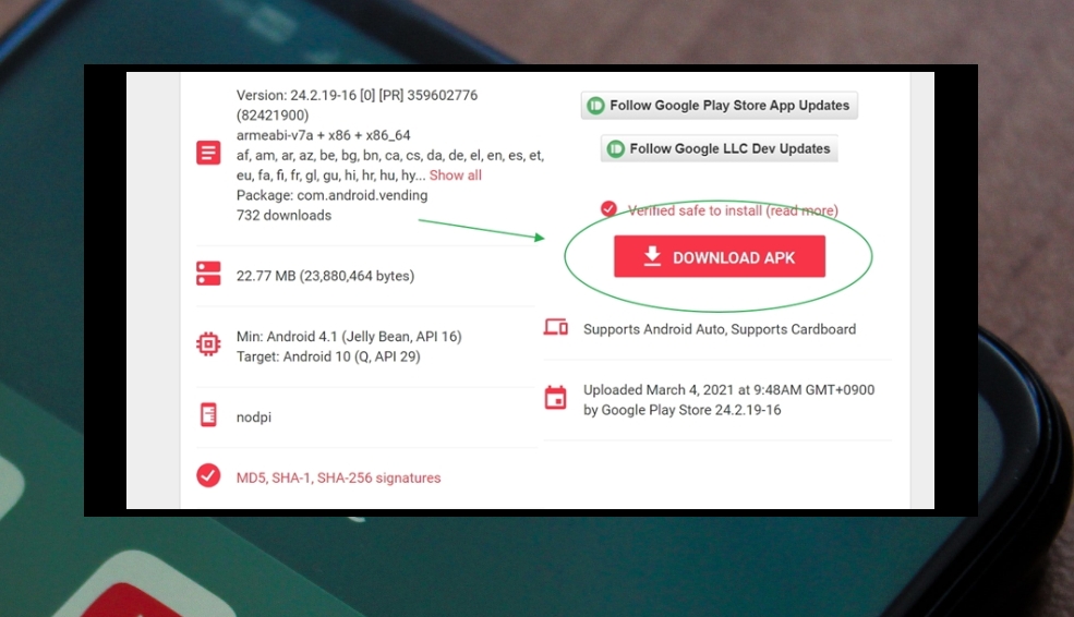 5. 최종적으로 구글 플레이 스토어 버전을 선택하면 이렇게 apk를 다운로드 받을 수 있는 페이지가 나타나요. 해당 페이지를 보면 여러 가지 관련 설명이 있는데요. 여기서 주의 깊게 볼 부분은 최소사양을 의미하는 Min 부분과 권장사양을 의미하는 Target 부분이에요. 이를 참고하여 구글 플레이 스토어 버전을 선택해 주세요.