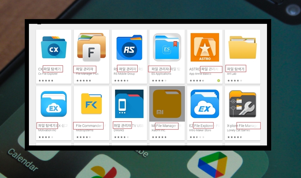 7. 전송한 apk 파일을 실행하면 구글 플레이 스토어 인스톨이 진행되는데요. 실행을 하려면 파일관리자 또는 파일탐색기 어플을 이용해야 해요. 대부분의 안드로이드 OS가 탑재된 스마트 기기에는 해당 앱이 기본으로 장착되어 있어요. 명칭이 기기에 따라 다르기 때문에 다음과 같은 리스트를 참고해 주세요.