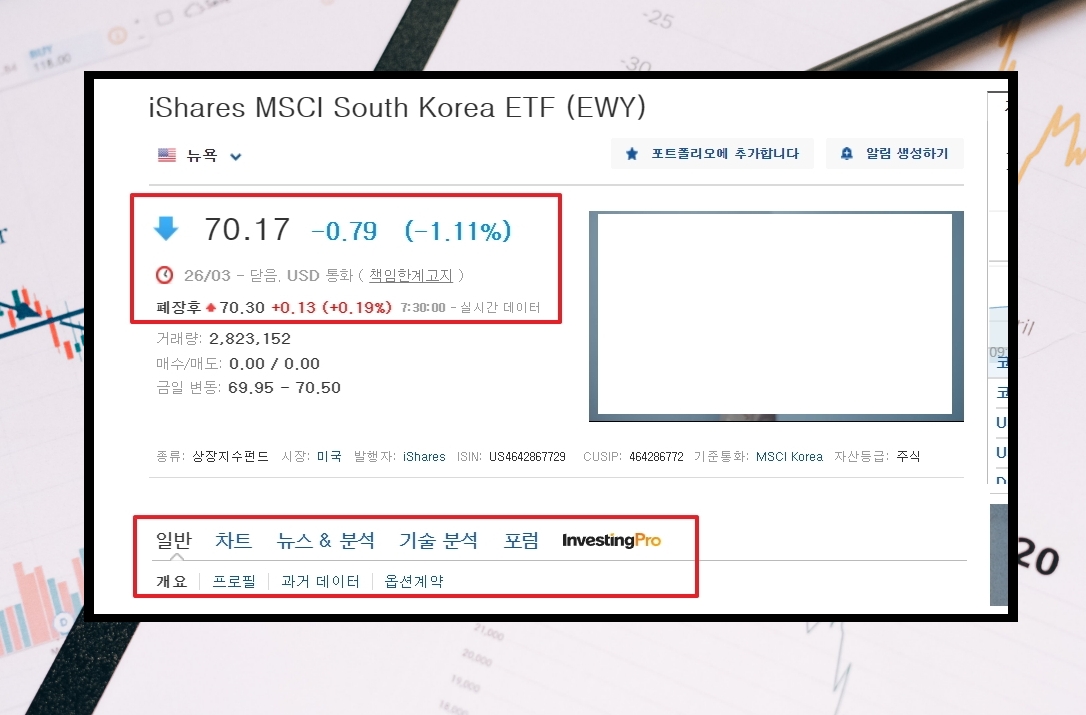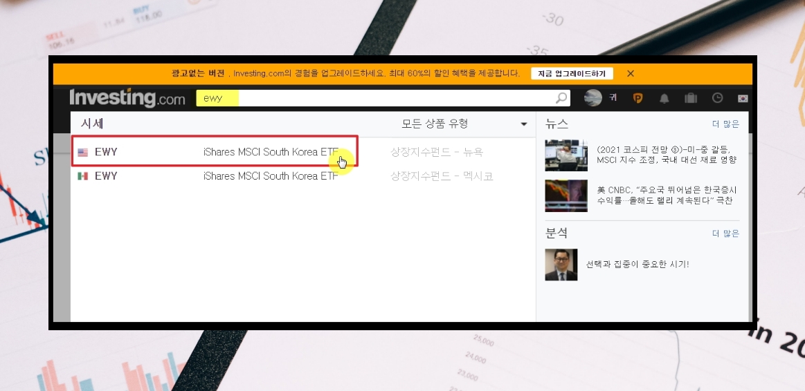 6. 인베스팅에서 검색창에 EWY를 입력해 봅니다. 그럼 MSCI 한국 ETF를 찾을 수 있습니다. 해당 ETF 종목을 선택해 봅니다.