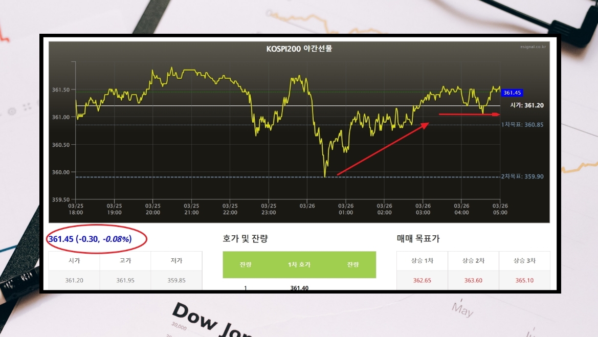 4. 전날 우리 주식시장이 끝난 이후부터 다음날 주식시장이 열리기 전까지 우리 코스피 선물지수가 어떤 흐름을 보였는지 해당 지표로 알 수 있습니다. 야간선물이 마이너스로 끝난 경우에는 다음날 코스피 종합지수가 마이너스로 시작할 가능성이 높습니다. 물론 100%는 아니고, 시기에 따라 다르겠지만, 대체적으로는 이런 방향으로 흘러갑니다.