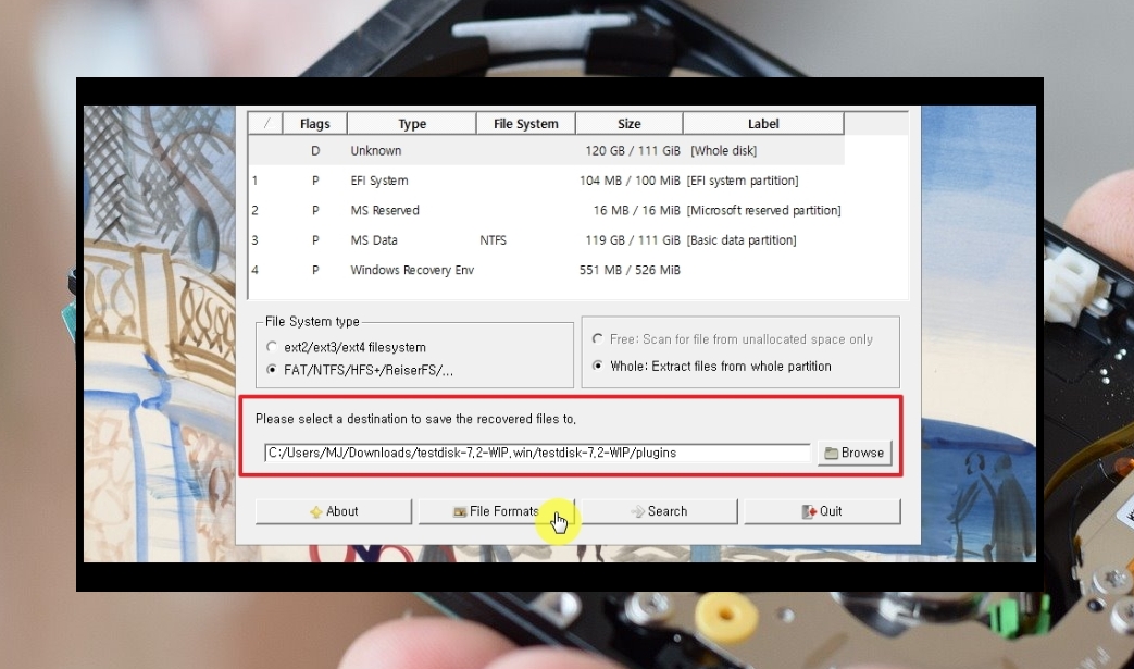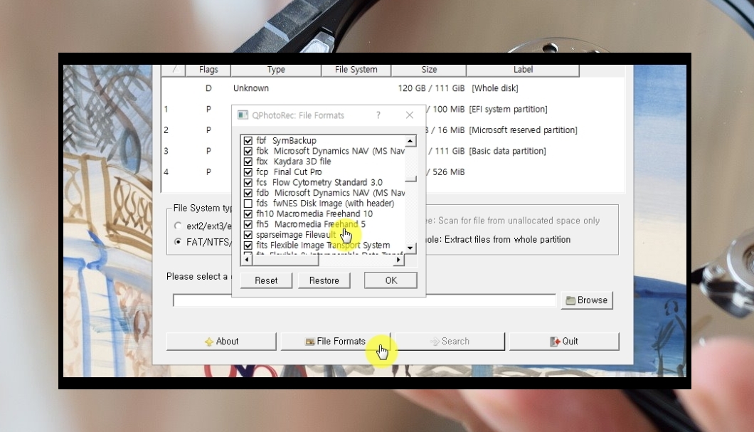 5. 두 번째는 삭제된 파일에 대한 확장자를 지정하는 일입니다. 확장자를 지정하지 않으면 과거에 삭제된 모든 데이터를 복구하게 됩니다. 이렇게 되면 원하는 데이터를 찾는 데에 시간이 걸릴 수 있습니다. 이런 수고로움을 예방하기 위해서는 [File Formats]를 눌러 삭제된 데이터의 확장자를 지정해 줍니다.